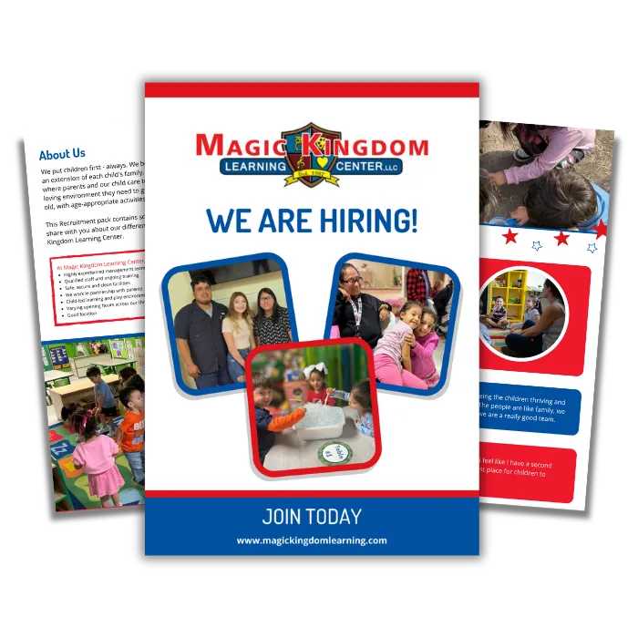 At Magic Kingdom Learning Center, we are a close-knit team that goes above and beyond to create a family feel in our centers. We hire only the most passionate, committed and experienced individuals to create a culture of positivity and encouragement, meaning we hire those who can be positive role models for the children.